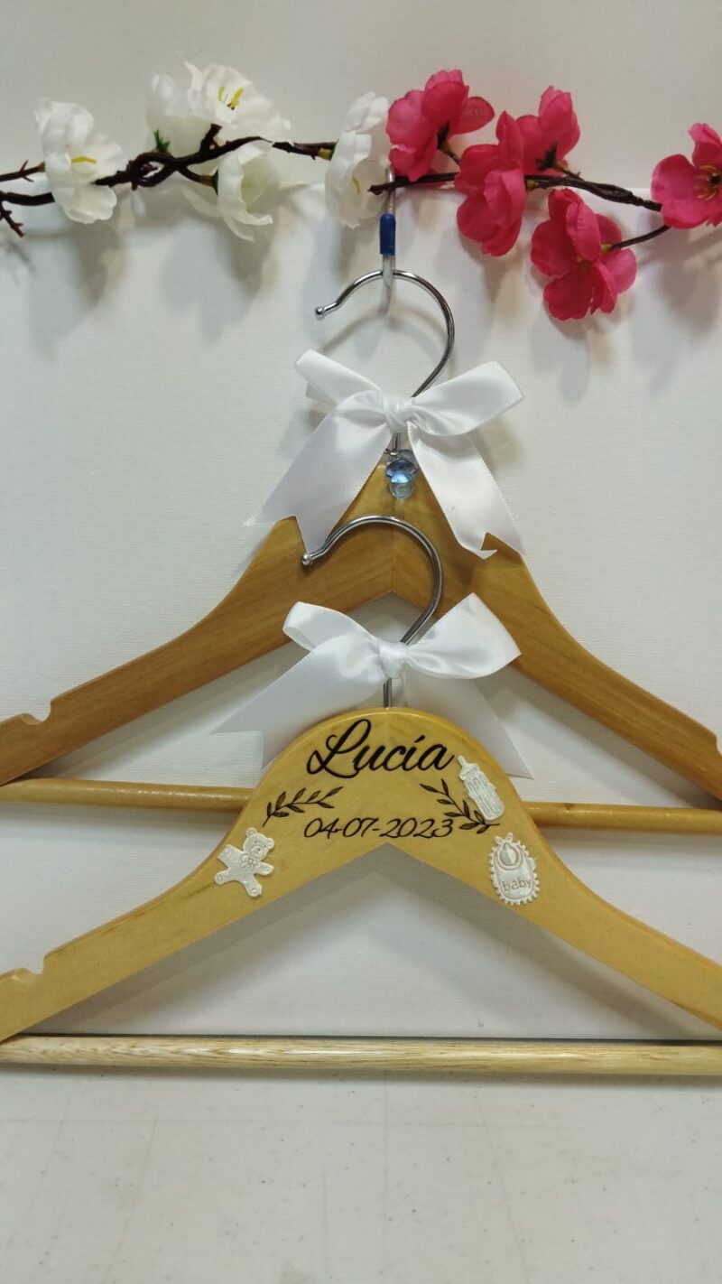 Percha de madera infantil, personalizada con nombre, adornos y fecha de nacimiento, con un pequeño abalorio de chupete a juego con los colores elegidos.